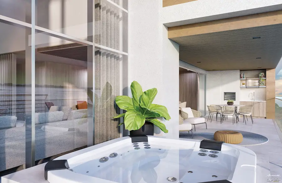 - Terraço com spa e churrasqueira, de frente para o Guaíba